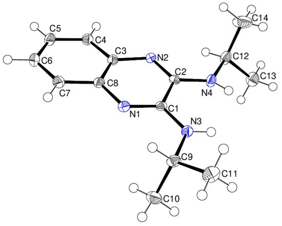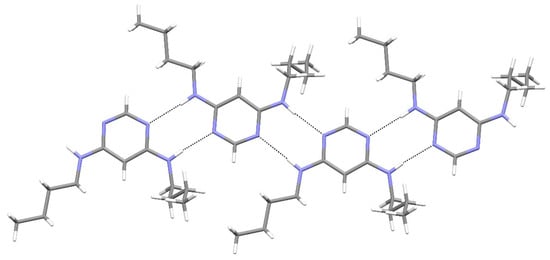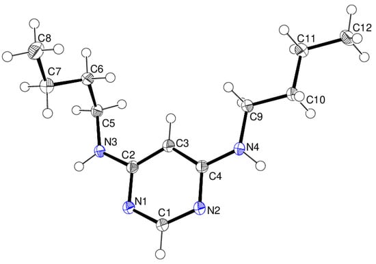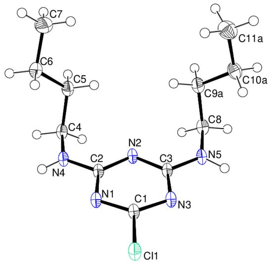 The molecular structure of compound 12 is shown in Figure 16. There is one molecule in the asymmetric unit in the triclinic space group P . Both pendant N-butyl chains project to the same side of the triazine ring. The N4–C7 chain shows a gauche–anti (ga) conformation as indicated by the N4—C4—C5—C6 and C4—C5—C6—C7 torsion angles of −61.76 (17) and 179.76 (15)°, respectively. The N5–C11 chain is disordered over two orientations in a 0.579 (5):0.421 (5) ratio, but both disorder components also show a ga conformation [N5—C8—C9a—C10a = 68.3 (2)°; C8—C9a—C10a—C11a = −168.0 (3)°; N5—C8—C9b—C10b = −68.6 (3)°; C8—C9b—C10b—C11b = 174.3 (4)°]. Compound 12 is a polymorph of the structure reported by Aldilla et al. [] with reference code KEFLUK in the Cambridge Structural Database [], which was recrystallised from trichloromethane solution. In KEFLUK both butyl arms have anti–anti conformations and are disordered. It is notable that compound 12 [V = 667.35 (5) Å3; ρ = 1.283 g cm−3] is significantly denser than KEFLUK [V = 731.93 (14) Å3; ρ = 1.170 g cm−3], which suggests that compound 12 (recrystallised from DCM/light petroleum ether) can pack more efficiently and is the more stable polymorph.