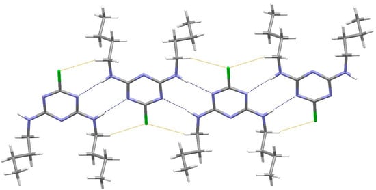 - Aldilla, V.R.; Bhadbhade, M.; Bhattacharyya, S.; Kumar, N.; Rich, A.M.; Marjo, C.E. Controlling the distance between hydrogen-bonded chloro-s-triazine tapes: Crystal engineering using N-alkyl chains and the influence of temperature. CrystEngComm 2017, 19, 4749–4758. [Google Scholar] [CrossRef]