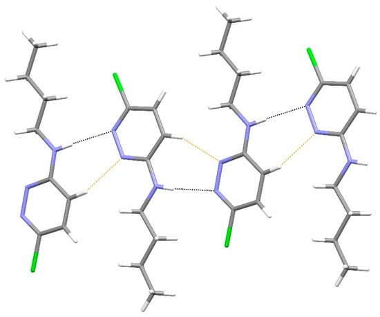 In the crystal of compound 19, hydrogen-bonded chains (or supramolecular tapes) propagating in the [001] direction are formed by pairwise N3–H1n…N1 hydrogen bonds involving the NH group and the adjacent N1 atom of the pyrimidine ring, which generate centrosymmetric (8) loops []. When pairwise weak C4–H4…N2 interactions are considered [also (8) loops], then (010) supramolecular sheets (Figure 15) arise.