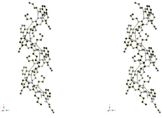 Figure 24, Figure 25 and Figure 26 are stereoviews together for compounds 16–18. These allow a clearer view of the helical axis for each one and the chain symmetry can be seen and compared (41, 21 and 31). To view the images in 3D, use a pokescope or stereoviewer on a print. Alternatively, view the images on a mobile phone. Look up close blurring of the images but creating one image, then slowly move the phone or page away to bring the 3D image into focus.