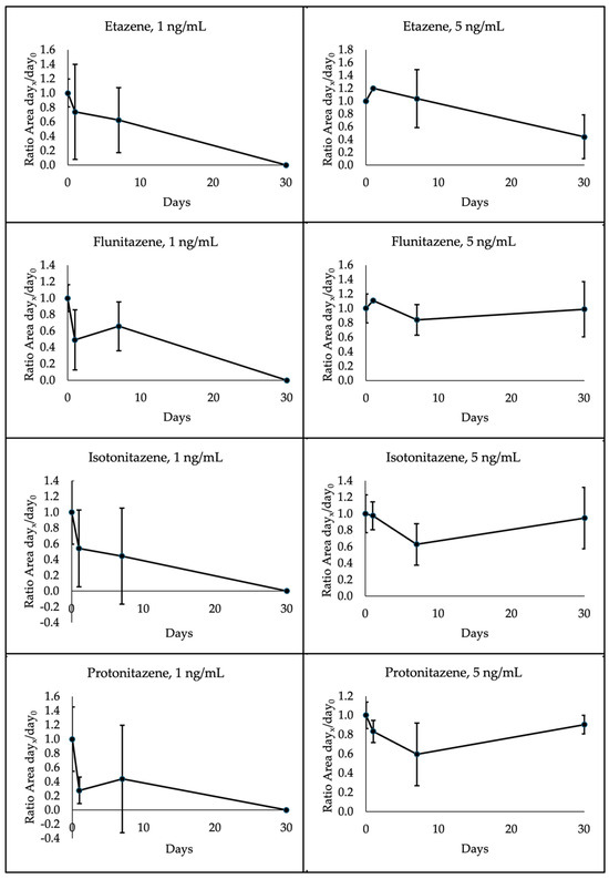 Vitrano, A.; Di Giorgi, A.; Abbate, V.; Basile, G.; La Maida, N.; Pichini, S.; Di Trana, A. Evaluation of Short-Term Stability of Different Nitazenes Psychoactive Opioids in Dried Blood Spots by Liquid Chromatography-High-Resolution Mass Spectrometry. Int. J. Mol. Sci. 2024, 25, 12332. https://doi.org/10.3390/ijms252212332