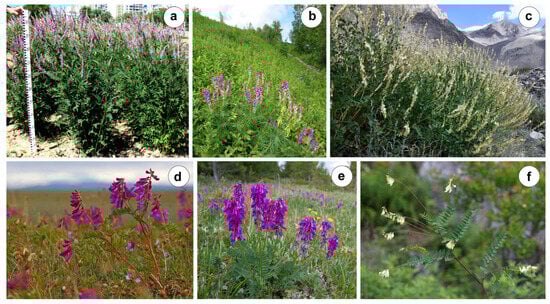 The studied species have different ranges of their growing areas and different ecological and cenotic features. Hedysarum alpinum L. is a species with a wide range that extends from Eastern Europe to North Korea and the Indian subcontinent and from subarctic America to the North American states [,,]. This species grows in wet meadows and in the areas of sparse forests and bushes along river valleys []. The range of H. hedysaroides (L.) Schinz et Thell. extends from subarctic and subalpine Eurasia to Alaska [,]. The type subspecies is distributed in the alpine belt of the Pyrenees, Alps, Sudetes, and Carpathians. H. arcticum B. Fedtsch grows in the Arctic and adjacent forest zones, mountain tundras of Arctic Europe, and the Arctic part of Eastern Siberia [,]. H. consaguineum DC. and H. theinum Krasnob. grow in the high mountain zone in the south of Western and Central Siberia and in Eastern Kazakhstan; the range of H. theinum extends into Western Mongolia and Central Asia [,]. The typical habitats of H. consaguineum are alpine and subalpine meadows, rocky placers, and tundras. H. theinum is distributed in the alpine and subalpine meadows and adjacent areas of the forest belt. The ecological niches of these two species may sometimes overlap. H. flavescens Regel et Schmalh. is widespread in Central Asia (Western Tian Shan, Pamir-Alay Mountains), the Hindu Kush, and Xinjiang, where it grows in the subalpine meadows at an altitude of 2500–3100 m [,]. H. sachalinense B. Fedtch. is widespread on Sakhalin Island, where it grows on the coastal rocky slopes, occasionally entering the goletsky belt []. H. ussuriense Schischk. et Kom. is endemic to the Southern Sikhote-Alin, found in the south of Primorsky Krai, where it is found in several localities within the carbonate rocks []. At the same time, Chang et al. reported that the range of this species extends from the Russian Far East to Central China and North Korea and to Northern and Central Japan []. In Figure 1, several studied species of the Hedysarum sect. Hedysarum growing in their natural habitat and on the trial plot of AIMAP (All-Russian Institute of Medicinal and Aromatic Plants) are presented.
