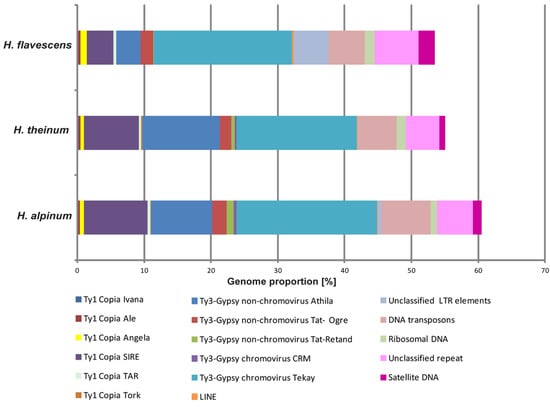Genome proportions of the most abundant DNA repeats in H. alpinum, H. theinum, and H. flavescens. The genome proportion of the individual repeat type was obtained as a ratio of reads specific to individual repeat types to all reads used for clustering analyses by the RepeatExplorer pipelines.