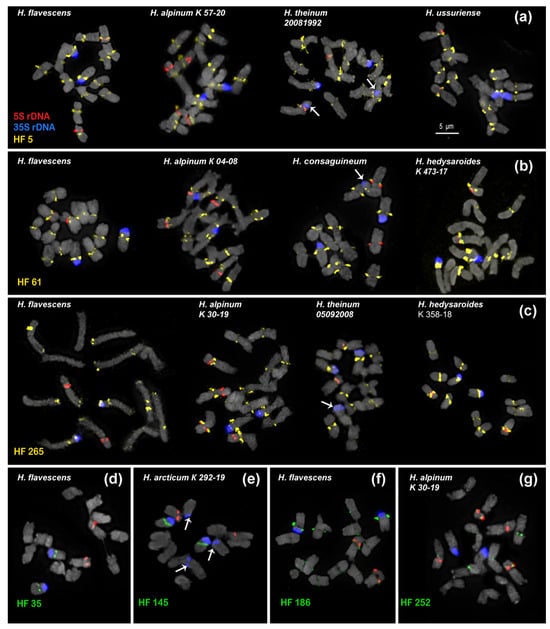 In H. hedysaroides (Figure 6f) and H. arcticum (Figure 6e), bright hybridization signals of HF 21 were revealed in the subtelomeric regions of the long arms of chromosome pairs 1–3 (the brightest signals), 6, and 7.