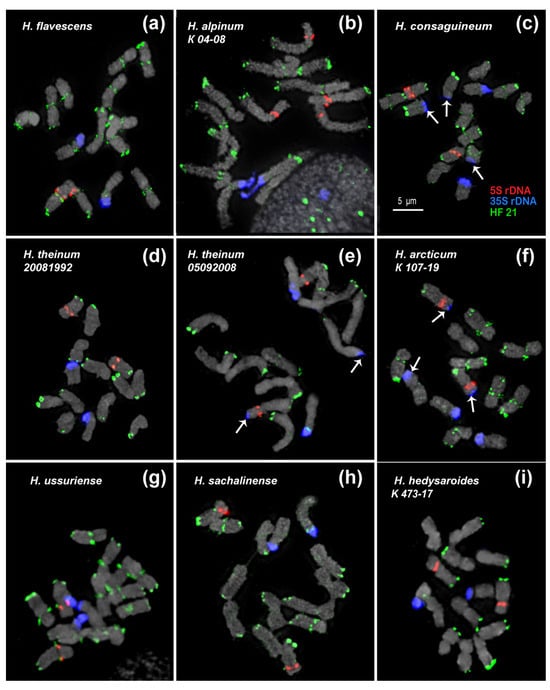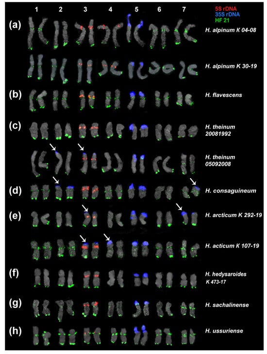 Karyotypes of the studied accessions of H. alpinum (a), H. flavescens (b), H. theinum (c), H. consaguineum (d), H. arcticum (e), H. hedysaroides (f), H. sachalinense (g), and H. ussuriense (h) after FISH with 5S rDNA (red), 35S rDNA (blue), and satellite repeat HF 21 (green) (the same metaphase plates as in Figure 4). Arrows point to the polymorphic sites of 35S rDNA. The correspondent probes and their pseudocolors are specified on the right.