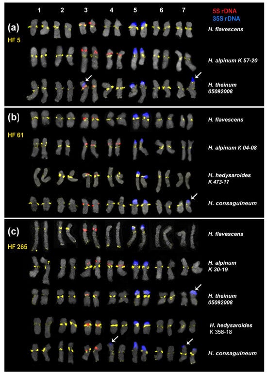 Karyotypes of the studied Hedysarum species after FISH with 5S rDNA, 35S rDNA, and satellite repeats (the same metaphase plates as in Figure 3): HF 5 (a), HF 61 (b), and HF 265 (c). Arrows point to the polymorphic sites of 35S rDNA. The correspondent probes and their pseudocolors are specified on the left: HF 5, HF 61, and HF 265 (yellow), and on the right: 35S rDNA (blue) and 5S rDNA (red).