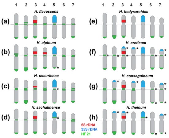 In the karyotypes of both H. alpinum and H. ussuriense, we observed clusters of HF 21 in the pericentromeric and subtelomeric regions of chromosomes, which were not revealed in other studied species. According to the previous phylogenetic data, the plastid tree strongly supported separate groups, which included H. alpinum and H. ussuriense [,]. This is generally consistent with our results since we detected unique minor 5S rDNA loci in the karyotype of H. alpinum.