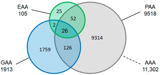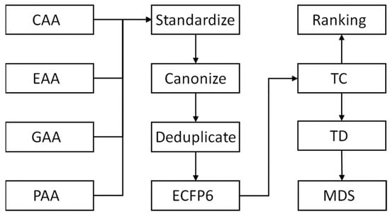 The further processing is sketched in Figure 6. In a standardization step, the PAA set was cleaned of salts, and stereochemical information was removed using the KNIME [] Chemical Identifier Resolver (CIR) node (AlvaScience, Lecco, Italy). Then, all sets were converted to canonical SMILES using OpenBabel []. These were copied into one file and sorted lexicographically, and duplicates were removed. Set memberships of each compound were stored in a table with five columns—SMILES—and columns representing the four sets CAA, EAA, GAA, and PAA. Boolean entries true or false in these columns indicate whether a compound belongs to the set. For this step and all forthcoming computations, we used R version 4.3.1 [].