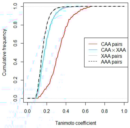 Comparing the cumulative relative frequencies of Figure 3, we notice that TCs of AAAs are tendentially slightly lower than those of CAA × XAA, while those of CAAs are in turn somewhat higher than those of CAA × XAA. This can, as well, be seen by comparing the histograms of Figure S1, and is also numerically confirmed in Table 2. The first and the third quartiles, as well as the reported quantiles, median, and mean are lowest for AAA and highest for CAA TCs. It is also interesting to note that the AAA TCs have a maximum value of 1, meaning there must be pairs of structures with identical fingerprints among our AAs (cf. SI section Choice of Fingerprints and Figure S2).