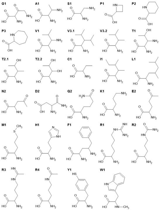 The structures of Figure 4 have labels composed of a one-letter CAA abbreviation and one or two numbers, e.g., G1 is the highest ranked XAA for glycine and correspondingly A1 for alanine. Table 4 lists, for each CAA, the highest TCs, the corresponding XAA (or CAA) with its abbreviation (ID) from Figure 4, and its set memberships, e.g., G1 has a rather low TC of 0.45 with G. It is included in GAAs, but not in EAAs nor PAAs. For alanine, the highest TC of 0.611 is achieved twice, by A1 and V (omitted in Figure 3, as the CAA structures are generally known). For serine, we again have just a unique highest ranked XAA, S1, with a TC of 0.6. Proline has several analogs with rather high TCs (see Figure S4). The three highest ranked XAAs are labeled P1, P2, and P3 in Figure 4. For V, we have four AAs with TC values above the threshold of 0.65. The highest-ranked structure is labeled, as usual, with V1. The second highest-ranked is identical with A1, i.e., label V2 does not appear in Figure 4 or Table 4. The next highest-ranked structures both have the same TC of 0.667 and thus have labels V3.1 and V3.2 to indicate that both achieve rank three. For T, we have, three times, TC above 0.65, achieved by T1 and the equally scoring T2.1 and T2.2. For cysteine (C), the highest TC is 0.619, i.e., below the threshold of 0.65. Thus, only the highest ranked XAA for C, C1, is depicted in Figure 4. The highest-ranked structure for isoleucine (I) is I1, with a TC of 0.667, and there are no further AAs with TC above 0.65. The most similar AA for leucine (L) is L1, with a TC of 0.643. The highest-ranked structure for N is D and vice versa. We therefore depict the second highest-ranked D2 and N2 in Figure 4. The situation is similar with Q and E, leading to Q2 and E2 shown in Figure 4. The highest-ranked structure for lysine (K) is K1, with a rather high TC of 0.714, and there are no further similar AAs for K with TC above 0.65. The highest-ranked structures for M, H, and F are all below the threshold, and are labeled M1, H1, and F1. For R, the four highest TCs are above 0.65, and the corresponding structures are shown as R1, R2, R3, and R4 in Figure 4. Finally, for Y and W, the highest-ranked AAs again have TCs below 0.65, and the corresponding structures have labels Y1 and W1 in Figure 4.