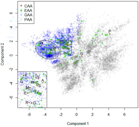 To visualize similarities among AAs, we used classical Multi-Dimensional Scaling (MDS, [,,,]). MDS algorithms take a distance matrix as input and calculate n-dimensional coordinates for each object, i.e., AAs, such that Euclidean distances in n-dimensional space optimally represent the input distances. We chose n = 2 to represent AAs as a 2-dimensional scatterplot. We used the R function cmdscale, which provides the method of Gower []. This method is also known as principal coordinate analysis []. To convert our similarity matrix given by TCs into a distance matrix, we used the general relationship between similarity and distance [], i.e., similarity = 1/(1 + distance), and calculated the Tanimoto Distances (TD) as TD = (1—TC)/TC.