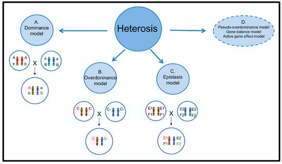 In addition to these classic quantitative genetic hypotheses, several other models (Figure 1D), such as the pseudo-overdominance hypothesis [], the gene balance hypothesis [], and the gene activation hypothesis [], have been proposed to explain the genetic mechanisms of heterosis.