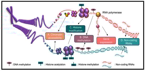 Hybridization often induces global changes in epigenetic modifications, which in turn alter gene expression. Increasing evidence suggests that epigenetic regulation plays a pivotal role in the formation of heterosis [,,,,]. Epigenetic modifications (Figure 2), including chromatin accessibility, DNA methylation, histone modifications, and non-coding RNAs, are essential for plant development, evolution, and environmental adaptation [,]. These modifications influence gene regulatory networks and contribute to the enhanced performance observed in hybrid progeny.