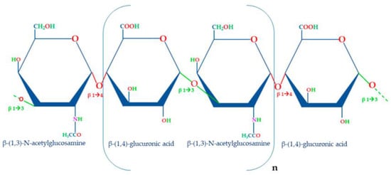 Hyaluronic acid (HA) is an important member of the glycosaminoglycans (GAGs). Compared to other GAG members, HA consists of repeating units of (1,4)-glucuronic acid (GA) and (1,3)-N acetylglucosamine (NAG) that are repeatedly linked together by alternating 1,3 and 1,4 glycosidic bonds [] (Figure 1).