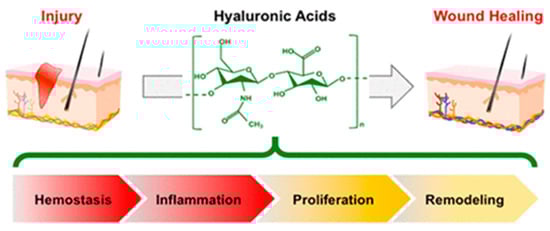 HA has many structural and physiological functions within tissues, such as extracellular and cellular interactions, growth factor interactions, regulation of osmotic pressure, and tissue lubrication. In this way, it helps maintain the structural and homeostatic integrity of tissues []. It is responsible for forming associations with collagen, fibrin, and other matrix molecules. The early response to tissue injury includes the formation of a temporary matrix rich in hyaluronan and fibrin, which supports the influx of fibroblasts and endothelial cells into the wound site and the subsequent formation of granulation tissue []. Whether HA is bound to cells or to extracellular matrix components, its hydrophilic nature creates an environment permissive for the migration of cells to new tissue sites, while its free-radical scavenging and protein exclusion properties offer protection to cells and extracellular matrix molecules against free radical and proteolytic damage. These represent some of the properties that can mediate the healing of both acute and chronic wounds.