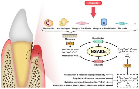 - Ren, J.; Fok, M.R.; Zhang, Y.; Han, B.; Lin, Y. The Role of Non-Steroidal Anti-Inflammatory Drugs as Adjuncts to Periodontal Treatment and in Periodontal Regeneration. J. Transl. Med. 2023, 21, 149. [Google Scholar] [CrossRef] [PubMed]