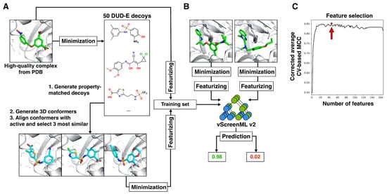 Figure 1), with key differences described in the Materials and Methods section. As noted above, vScreenML 2.0 reduces inconvenient software dependencies and also includes new features not present in the original implementation. These include ligand potential energy, buried unsatisfied atoms for select polar groups in ligand, additional 2D structural features of ligands, the complete characterization of interface interactions in protein–ligand complexes and pocket-shape features (