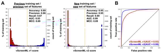 Figure 2A). The primary distinction that is evident between the two distributions is that vScreenML 2.0 miscategorized fewer of the active complexes with low scores, compared to the original: this is reflected numerically in the higher recall value for vScreenML 2.0 (from 0.67 in the original to 0.89 in the new model). The improved recall, coupled with improved precision, leads to a dramatic improvement in the Matthews correlation coefficient (MCC) for the new model (from 0.69 in the original to 0.89 in vScreenML 2.0). The improved performance is also dramatically evident when the same results are plotted as a receiver operating characteristic (ROC) curve (