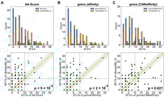 top). It is evident from the superposed histograms that AA-Score had more targets with very low EF1% values (0 to 7), whereas vScreenML 2.0 had more targets with higher EF1% values (10 and above). Extending the analysis to compare individual targets (