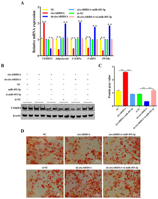 Shen, Y.; Liang, Y.; Yuan, Z.; Qiao, L.; Liu, J.; Pan, Y.; Yang, K.; Liu, W. circARID1A Inhibits Tail Fat Cell Differentiation in Guangling Large-Tailed Sheep by Regulating the miR-493-3p/YTHDF2 Axis. Int. J. Mol. Sci. 2024, 25, 12351. https://doi.org/10.3390/ijms252212351