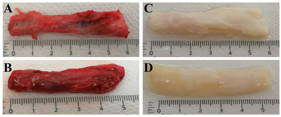 Macroscale appearance of the human urethral tissue: (A,B) urethral tissue prior to the decellularization process; (C) urethral tissue post-ED protocol decellularization; (D) urethral tissue post-DD protocol decellularization.