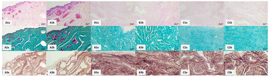 Histological structure of a representative panel of human spongy urethra as seen in control and decellularized samples using ED and DD protocols. HE staining of the control samples. (A1a,A1b) demonstrate the normal structure of the human spongy urethra with stratified columnar epithelium, connective tissue (lamina propria) with blood vessels, lymphatic vessels, collagen, and elastic fibers (normal structure of collagen and elastic fibers were best seen using Masson green trichrome staining and orcein, respectively). Under the lamina propria, there are two layers of smooth muscle. The outermost layer of the urethra is the connective tissue adventitia. Outside, the urethra blends with the tissue of the corpus spongiosum. (A2a,A2b) depict the control sample stained with Masson green trichrome, which shows the elaborate network of collagen fibers. (A3a,A3b) capture orcein-stained control samples for elastic fibers visualization. (B1a–B3b) are photomicrographs of decellularized experimental samples according to the ED protocol. The pink color in HE-stained samples (B1a,B1b) has diminished saturation. The main reason is the loss of cellular components with eosinophilic (pink) cytoplasm. Collagen fibers (B2a,B2b) have no visible changes in structure or number compared to controls. The same applies to the orcein-stained samples (B3a,B3b). (C1a–C3b) show the photomicrographs of samples decellularized according to the DD protocol. Their characteristics are virtually the same as in the ED protocol, namely a slightly lower saturation in HE-stained samples (C1a,C1b) and normal density and structure of collagen (C2a,C2b) and elastic (C3a,C3b) fibers.