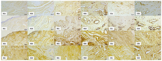 Immunohistochemical visualization of a representative panel of human spongy urethras as seen in control (A) and decellularized samples using ED (B) and DD (C) protocols. Immunohistochemical visualization of collagen IV in control samples (A1a–A1d) shows that collagen IV is found mainly around blood vessels and under the epithelial lining since it is an integral component of basal laminae. ED protocol of decellularization did not have any detrimental effect on collagen IV, evidenced by unaltered collagen IV positivity (B1a–B1d). The same is true for the DD protocol (C1a–C1d)—there is no observable change in collagen IV distribution after the decellularization process. (A2a–A2d) show fibronectin positivity in the control samples. Fibronectin is widely distributed in the samples since it is a multiadhesive glycoprotein vital for ECM integrity. (B2a–B2d) capture the fibronectin positivity in ED protocol samples. There is a lack of any detectable change in fibronectin distribution. The same applies to DD protocol samples (C2a–C2d)—the fibronectin positivity is ubiquitous, as seen in controls.