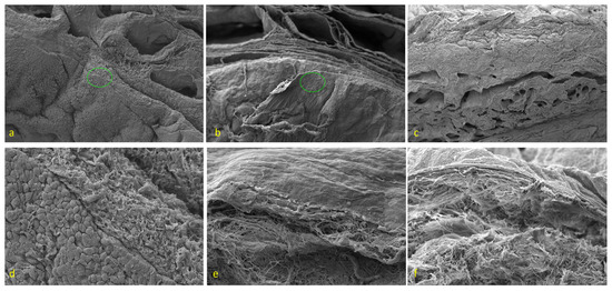 Scanning electron microscopy representative panel. (a) A topography of native sample in overview. Mag ×104. Left bottom displays a sheet of stratified columnar epithelium, attached to the basal lamina, a layer continuation with underlying connective tissue. Vascular spaces of the adjacent corpus spongiosum in the field of the cutline surface. The green circle is the region of interest (ROI) described in (d). (b) A topography of ED-processed sample in the overview. Mag ×89. None of the epithelium faces the lumen of the urethra. No detectable changes in ECM architecture at the overview level. The green circle is the (ROI described in (c,e) A topography of DD-processed sample in the overview. Mag ×80. None of the epithelium faces the lumen of the urethra. The minimal changes in ECM architecture at the overview level. (d) A detail of the encircled ROI of the native sample shows a borderline of the epithelium and the lamina propria with ECM. A top view of superficial columnar cells is displayed in a polygonal shape. Epithelial cells firmly adhere to the basal lamina. Mag ×596. (e) A detail of the encircled ROI shows a topography of decellularized mucosa using the ED protocol. No epithelium is evident; the naked lamina basalis reflects the smooth surface and the collagen fibers in the ECM almost show a natural architecture. Mag ×787. (f) A detail of the topography of decellularized mucosa using the DD protocol. No epithelium, the smooth lamina basalis, and a mild untangling of collagen bundles just beneath. Mag ×700.