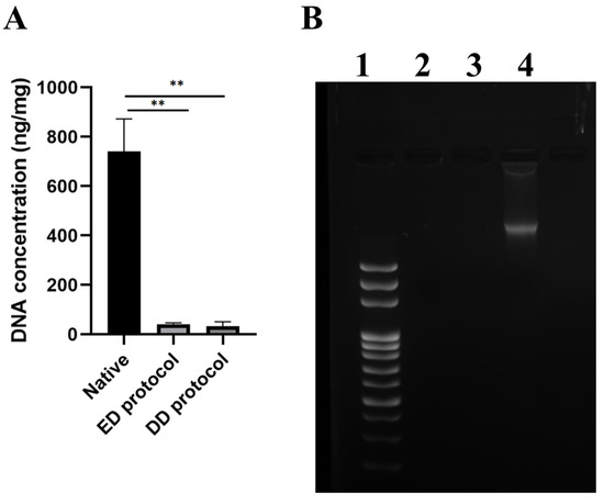 Qualitative and quantitative DNA content of native and decellularized human urethra evaluating the effectiveness of the decellularization process to remove cell components. (A) Quantification of DNA in native and decellularized samples (ng/DNA per mg/tissue dry weight). Results as mean ± SD, n = 18, ** p ≤ 0.001, t-test; (B) Qualitative fragment length analysis of genomic DNA in 1.5% agarose gel. 1—length ladder, 2—ED protocol decellularized sample, 3—DD protocol decellularized sample, 4—native urethra sample.