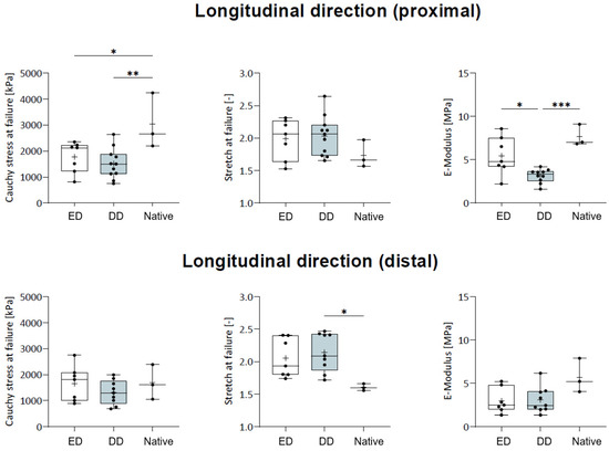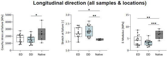 For the combined longitudinal load–deformation trials, Cauchy stress was significantly lower in the DD group (1494.8 ± 518.4 kPa) when compared to the native group (2439.7 ± 578.7 kPa; p = 0.013). The ED group (1693.0 ± 568.7 kPa) was no different from the DD and native groups, respectively (Figure 6). Stretch at failure was significantly lower between the native state (1.98 ± 0.29) and ED group (2.07 ± 0.28; p = 0.030) or the (DD 1.67 ± 0.14) when compared to the ED group (p = 0.005), respectively, being no different between the ED and DD groups. Emod was significantly lower in the ED group (4.13 ± 2.09 MPa; p = 0.007) and in the DD group (3.52 ± 1.48 MPa; p < 0.001) when compared to the native group (6.68 ± 1.66 MPa).