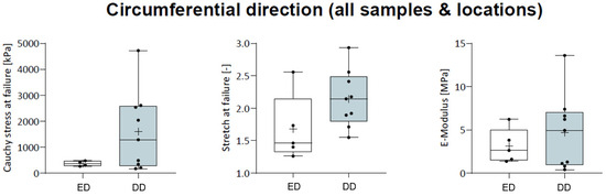Considering the mechanical properties such as Cauchy stress at failure (ED: 811.2 ± 969.4 kPa, DD: 1600 ± 1475.5 kPa), stretch at failure (ED: 1.5 ± 0.5, DD: 2.1 ± 0.4), and elastic modulus (ED: 3.1 ± 1.7 MPa, DD: 4.7 ± 4.2 MPa), no difference was observed between protocols (p > 0.05; Figure 8). However, group DD tended to demonstrate higher mean and median values, and the range of properties within the groups appeared to have a larger spread, as indicated by the minimum and maximum values.