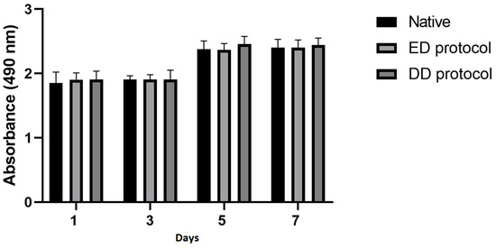 First, 4 cm2 of decellularized urethral tissue was cut into small pieces, added to 50 mL of Dulbecco’s Modified Eagle Medium (DMEM, Merck, Darmstadt, Germany), and washed on a shaker for 24 h at 37 °C. After 24 h, the medium was filtered through a 0.2-μm filter, and 10% fetal bovine serum (FBS, Merck, Darmstadt, Germany) was added. For biocompatibility testing, we used ATSCs as they are multipotent and can differentiate into various cell types, making them a valuable model. ATSCs were seeded in a 96-well plate at a concentration of 5 × 103 cells per well. The plates were incubated at 37 °C in a humidified atmosphere of 5% CO2 in the air for seven days. One plate was removed on days 1, 3, 5, and 7 to assess cell viability. Afterward, 20 μL of CellTiter 96 AQueosus One Solution Cell Proliferation Assay (Promega, Madison, WI, USA) was pipetted into each well, containing 100 μL of culture medium. The plates were incubated for 3 h at 37 °C. Absorbance was recorded at 490 nm using a 96-well plate reader BioTek EL 800 (Agilent, Vinooski, VT, USA). Unconditioned DMEM supplemented by 10% FBS was used as a negative control. All MTT tests were performed in sixplicates according to the standard protocol. The data are presented in the form of a graph.