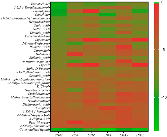 Heatmap showing the Glide scores of phytochemicals from Detarium senegalense against human PDE5, arginase 2, steroidogenic cytochrome P450 17A1, protein kinase C alpha, OGT, and adenosine deaminase.