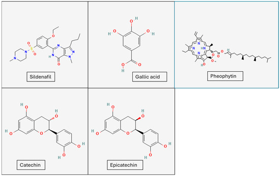 Structures of sildenafil, gallic acid, pheophytin, catechin, and epicatechin (source: PubChem online database https://pubchem.ncbi.nlm.nih.gov/).