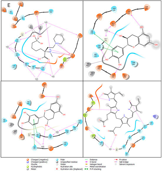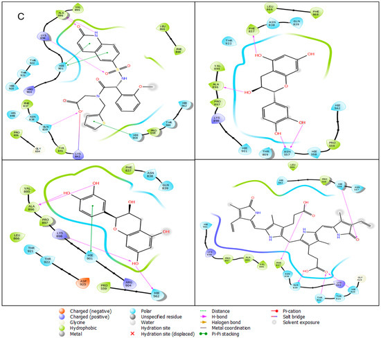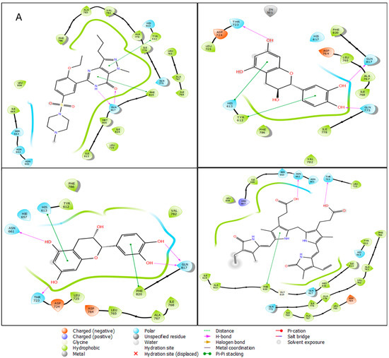 The molecular mechanics general Born surface (MM/GBSA) offers an effective means of calculating ligand–protein binding free energy. It is a measure of the amount of free energy involved in a particular set of interactions. For this study, MM/GBSA calculations were conducted using the Prime module of the Schrödinger suite. Our hit compounds showed comparable binding energy to the co-crystallized ligands. For instance, pheophytin showed similar binding energy to the adenosine deaminase enzyme as the co-crystallized ligand, with values of −71.91 and −77.9 Kcal/mol, respectively. Catechin exhibited superior binding energy to the arginase 2 enzyme compared with the co-crystallized ligand (−21.31 vs. −7.95 Kcal/mol). However, the co-crystallized ligands had better binding energies with PDE5 and protein kinase C alpha, as shown in Table 1 and Figure 5.