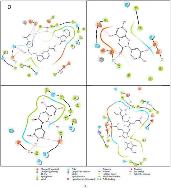 The molecular dynamic (MD) simulation for the native phosphodiesterase 5 enzyme (2H42) and the two complexes (2H42-epicatechin and 2H42-catechin) was executed using the Desmond module of the Schrödinger suite. The system setup, MD production, and trajectory analysis were performed as previously reported [65]. All simulations were carried out using the OPLS2005 force field. The protein–ligand complexes were bound in an orthorhombic box, with the box size calculation method set as buffer, all three distances set at 10 Å, then the volume of the box minimized. The TIP3P water model was used as the solvent model. Sodium and chloride ions were added to neutralize the overall charge of the system, and the salt concentration was set to 0.15 M to mimic physiological conditions. The standard protocols within the Maestro environment were employed to initially prepare and minimize the system. System relaxation was undertaken in an NPT ensemble at 300 K and 1 atm using a Nosé–Hoover thermostat and a Martyna–Tobias–Klein barostat, respectively. The MD simulation was performed for 100 nanoseconds (ns), and the trajectory sampling was set at an interval of 100 ps with 1000 frame numbers, allowing for extensive sampling of the conformational space. During the MD simulation, the long-range electrostatic interactions were calculated using the particle mesh Ewald (PME) method. The outputs of the simulation were visuallized and analyzed by MS-MD trajectory analysis and a simulation interaction diagram. The data were plotted using Origin version 6.0.