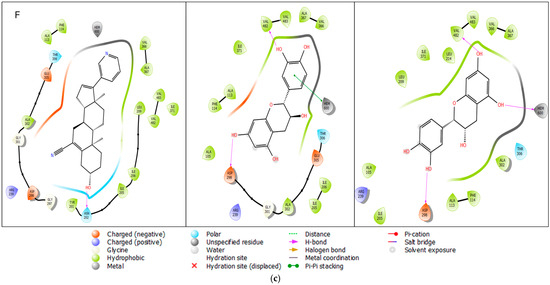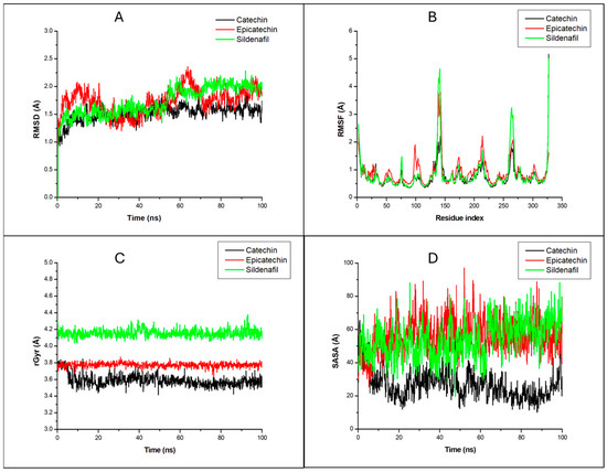 The interaction of amino acid residues of the PDE5, PKC, and steroidogenic cytochrome P450 17A1 enzymes with their respective standards and catechin were similar, making these worthy of further investigation. Therefore, molecular dynamic (MD) simulation analysis was performed to evaluate structural and functional relationships with the protein–ligand complex. The MD simulation emulates the biological system and gives information about the stability of the complex, conformational changes, and the individual residue flexibility/fluctuation during simulation [42,43]. The root mean square deviation (RMSD), root mean square fluctuation (RMSF), radius of gyration (rGyr), pressure swing adsorption (PSA), and solvent-accessibility surface area (SASA) were analyzed, as shown in Table 2 (means ± SEM) and Figure 6.