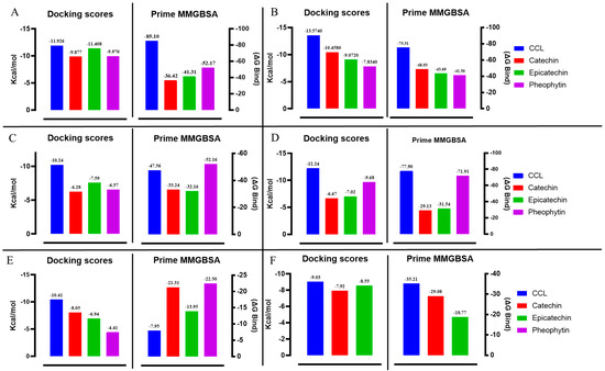 Docking and Prime MM/GBSA scores of the co-crystallized ligand (CCL), catechin, epicatechin, and pheophytin with (A) human PDE5, (B) protein kinase C alpha, (C) OGT, (D) adenosine deaminase, (E) arginase 2, and (F) steroidogenic cytochrome P450 17A1.