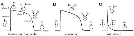 The species difference in the action potential waveform, which has been most extensively studied in the working myocardium, could largely be attributed to a difference in the repolarizing potassium channel currents (Figure 2; [27,28,29,30,31,32,33]). In humans, pigs, dogs, and rabbits (Figure 2A), the resting membrane potential (phase 4) is maintained by the IK1. The rapid depolarization (phase 0) is caused by the Na+ channel current followed by a rapid and partial repolarization caused by the transient outward current (Ito) to form a notch (phase 1). The plateau phase (phase 2) is caused by a balance between the inward flow of the L-type Ca2+ channel current (ICaL) and the gradually activating repolarizing K+ currents. The delayed rectifying K+ channel current (IK) is responsible for the early repolarization (phase 3). This current is composed of the rapidly activating component (IKr) and the slowly activating component (IKs); in most animals, the former component plays a larger role. IK1 also contributes to the later phase of repolarization. In the case of the guinea pig (Figure 2B), the IKs play a dominant role in repolarization and the role of IKr and Ito is small or lacking. Thus, the guinea pig action potential lacks the notch (phase 1). In the case of the rat and mouse (Figure 2C), repolarization is mainly caused by Ito and IKur, resulting in an extremely short action potential duration at depolarized membrane potentials (phase 3). The rat and mouse have characteristic electrophysiological, Ca2+-handling, and metabolic properties, which appear to support the high heart rate in these species [34,35,36,37,38]. In the rat and mouse ventricular myocardium under artificial stimulation at low frequencies, a relatively slow repolarization at negative membrane potentials is observed, which is sometimes called the late plateau phase [39]. This phase is caused by the extrusion of intracellular Ca2+ by the Na+-Ca2+ exchanger; the lowered repolarizing power at this phase due to the rapid inactivation of Ito probably permits the manifestation of the depolarizing effect of the Na+-Ca2+ exchanger current. The role of IKr is very small in the rat and mouse.