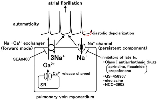 - Saito, T.; Suzuki, M.; Ohba, A.; Hamaguchi, S.; Namekata, I.; Tanaka, H. Enhanced late INa induces intracellular ion disturbances and automatic activity in the guinea pig pulmonary vein cardiomyocytes. Int. J. Mol. Sci. 2024, 25, 8688. [Google Scholar] [CrossRef]