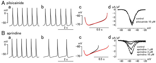 Effect of class I antiarrhythmic drugs pilsicainide and aprindine on the automatic activity of the guinea pig pulmonary vein myocardium and the persistent Na+ channel current (late INa) in isolated cardiomyocytes. (A) Pilsicainide affected neither the action potential (a–c) nor the late INa (d). (B) Aprindine reduced the firing rate of action potentials (a–c) and blocked the late INa (d). The action potential recordings were made before (a) and 3 min after (b) the application of 10 μM of the drugs. Expanded traces of the diastolic depolarization phase before (black) and after (red) drug application were overlaid (c). The current–voltage relationship for late INa under various drug concentrations was displayed (d). This figure was adopted from Ref. [84].
