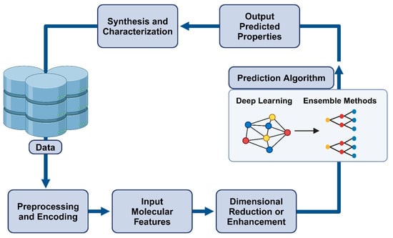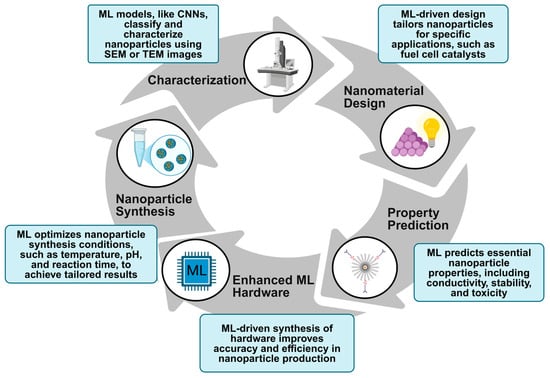 These two fields—nanotechnology and ML—are increasingly being used in conjunction to address modern technological and scientific challenges, leveraging the strengths of each to advance both. As depicted schematically in Figure 1, ML can help automate some of the aspects of discovering and synthesizing nanoparticles using trained models, accelerating progress in the field. A study conducted in 2021 demonstrated the potential of ML for material discovery by predicting suitable cathode materials for rechargeable zinc batteries, choosing 80 candidates from 130,000 possible materials, 70 of which had never been experimentally tested before [4,5]. Another example of ML’s impact in nanotechnology includes the use of convolutional neural networks (CNNs) to analyze scanning electron microscopy (SEM) images of nanostructures, achieving greater than 95% accuracy in nanoparticle classification [6]. This level of efficiency significantly reduced the time and labor needed for characterization, making it possible to conduct large-scale studies with improved speed and accuracy. These examples underscore ML’s transformative role in discovering nanoparticles with desired properties and automating labor-intensive processes in nanotechnology [7]. Additionally, nanochips can increase the power and efficiency of modern computers, potentially reducing the time and cost of training complex ML models [8].