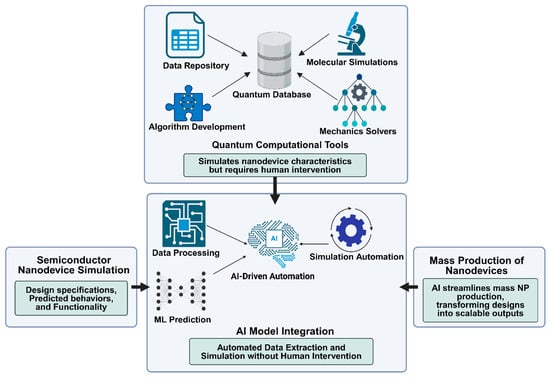 On the nanoscale, devices must follow a set of rules to be functional; often diverging from conventional macro-engineering standards. ML has demonstrated its ability to predict the properties of nanomaterials and can similarly guide the design and invention of nanomachines that traditional computational methods and experiments cannot simulate. Creating a dataset to train a model involves two key tasks: automating the deployment of tools from a quantum database and simulating representations of semiconductor nanodevices without human intervention [43]. This quantum database allows for the simulation of semiconductor nanodevices’ appearance and operation, though it still requires human interaction to utilize its tools. AI is also advancing the mass-scale production of simpler nanodevices, such as perovskites (nanoparticles used in highly efficient LEDs) with the help of catalytic biomolecules [44]. By employing an AI model, researchers can swiftly access data and simulate the specifications and functions of specific nanodevices, as illustrated in Figure 4.