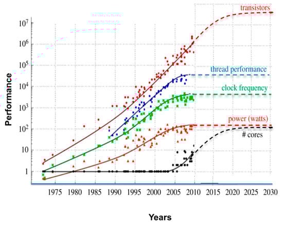 - Shalf, J. The future of computing beyond Moore’s Law. Philos. Trans. R. Soc. A 2020, 378, 20190061. [Google Scholar] [CrossRef] [PubMed]