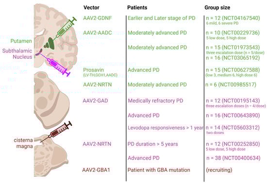 - Heiss, J.D.; Lungu, C.; Hammoud, D.A.; Herscovitch, P.; Ehrlich, D.J.; Argersinger, D.P.; Sinharay, S.; Scott, G.; Wu, T.; Federoff, H.J.; et al. Trial of magnetic resonance-guided putaminal gene therapy for advanced Parkinson’s disease. Mov. Disord. 2019, 34, 1073–1078. [Google Scholar] [CrossRef] [PubMed]