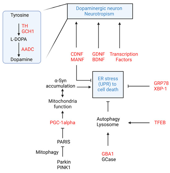 Major possible genetic targets of gene therapy in Parkinson’s disease and their related pathways. Targeting the accumulation of neurotoxins, such as alpha-synuclein, by modulating autophagy, enhancing mitochondrial biogenesis, or reducing ER stress-induced apoptosis could help preserve the dopaminergic cell population.