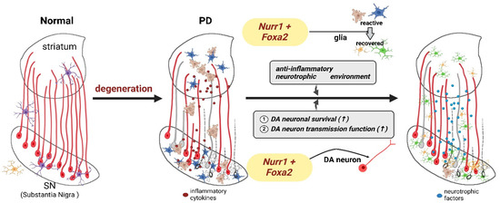 In an MPTP PD mouse model, AAV-mediated overexpression of Nurr1 and its co-transcription factor, Foxa2, in the midbrain, rescued neurons and a considerable number of striatal fibers [22]. Additionally, researchers rescued neurons by forcing the expression of those factors in neighboring glia, which synergistically protected degenerating DAnergic neurons in a paracrine mode (Figure 3). Providing gene therapy in both neurons and glia promoted neurodevelopment and protected DAnergic neurons against various toxic factors by suppressing the expression of neurotoxic pro-inflammatory genes [22]. Astrocytes and microglia are resident glial cells in the brain. Although they typically have neuroprotective roles, their function is compromised in disease states, which can lead to harmful inflammatory conditions. The pathological transformation of glial cells, along with the degeneration of neurons, is a critical factor in the pathogenesis of PD and, thus, is a prime target for its treatment. During degeneration, the expression of Nurr1 and Foxa2 in DAnergic neurons declines [16,21] and glial cells shift toward a damaging reactive state. Neurons with diminished Nurr1/Foxa2 expression become susceptible to the toxic environment of the deteriorating midbrain (Figure 3, middle). Forcing the expression of Nurr1 and Foxa2 in DAnergic neurons supports their survival [22]. The expression of these transgenes in glial cells fosters a neuroprotective environment by reducing pro-inflammatory cytokine secretion and enhancing the release of neurotrophic factors (Figure 3, right).