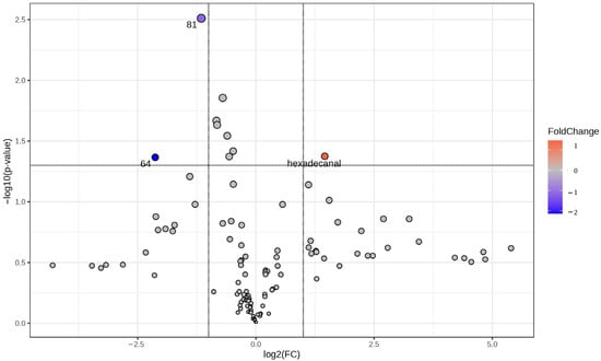 Table 3 shows the metabolites with significant fold-change values and p-values. Among them, hexadecanal showed the largest change, indicating its potential as an important biomarker for PE (Figure 1).
