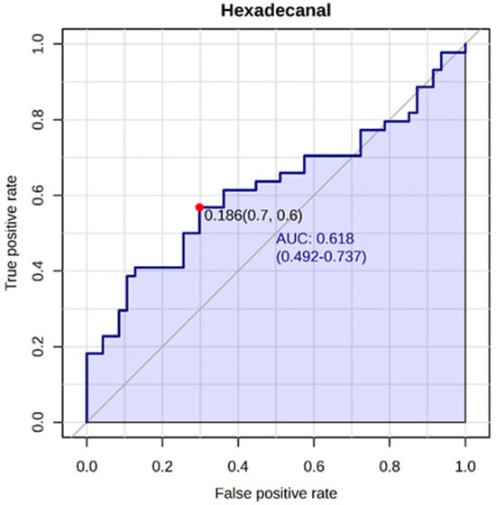 Based on the statistical analyses, hexadecanal proved to be the most significant metabolite with a high potential as a biomarker for PE. To further evaluate its diagnostic value, a receiver operating characteristic (ROC) curve was generated (Figure 2), which provides insight into its ability to discriminate between the PE and control groups by balancing sensitivity (true positive ratio) and specificity (true negative ratio). The area under the curve (AUC) for hexadecanal was calculated to be 0.618 (95% CI: 0.492–0.737), indicating a moderate diagnostic ability. The sensitivity was 0.6 (60%) and the specificity was 0.7 (70%), reflecting reasonable diagnostic performance. Although the AUC does not indicate exceptional predictive accuracy, hexadecanal shows promising potential as a biomarker for PE that warrants further investigation.