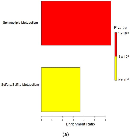 Sphingolipid metabolism stands out with an enrichment ratio higher than 4, highlighting it as the dominant metabolic pathway associated with the analyzed samples and significant metabolites. This level of enrichment suggests that alterations in sphingolipid metabolism may be a key factor in the pathophysiological processes within the placenta associated with PE, which is also confirmed by a very low p-value (less than 0.02). Although less pronounced, sulfate and sulfite metabolism also show a significant enrichment, with an enrichment ratio of about 3.5 and p-values between 0.04 and 0.06. Although the statistical significance is lower compared to sphingolipid metabolism, the results still indicate a possible link between this metabolic pathway and PE.